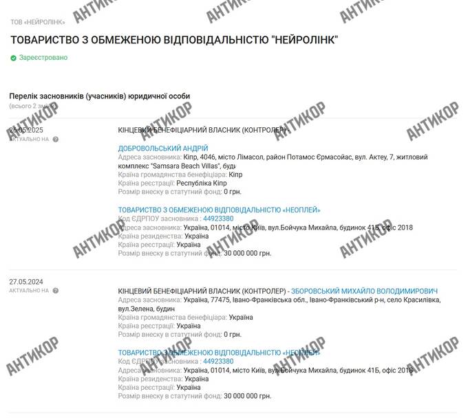 І очевидно саме тому у травні 2025 року Зборовського викреслили із засновників ТОВ «Нейролінк» і замінили на нікому невідомого кіпріота Андрія Добровольського, який проживає на віллі на набережній Лімасола.