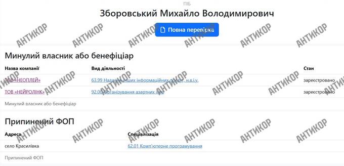 Якщо почати з простого — відкрити картку Зборовського на OpenDataBot, — картина вийде надзвичайно скромною. У 2020 році він зареєстрував ФОП з видом діяльності «комп’ютерне програмування». До цього — повна тиша. Ні компаній, ні інвестицій, ні стартапів.