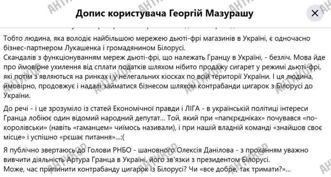 З чого випливає висновок, що він зумів налагодити контакт із представниками нинішньої української влади. І ті не лише закрили кримінальну справу за фактом контрабанди, через яку Гранц утік до Іспанії, а й не віджали бізнес. Ба більше – дозволили Артуру Гранцу зайнятися контрабандою цигарок у Євросоюз – бізнесом, який «кришується» на найвищому рівні, бо приносить реальні мільйони доларів. Але це ще не все – народний депутат від президентської партії «Слуга народу» Григорій Мазурашу писав у вересні 2022 року (!), що Артур Гранц налагодив контрабанду білоруських цигарок і є бізнес-партнером самопроголошеного президента Білорусії Олександра Лукашенка.